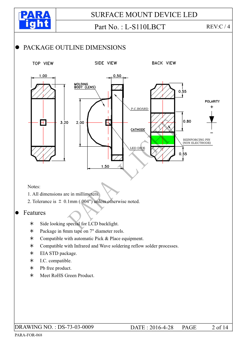 LED发光器件 光鼎LED发光元件 贴片式 Side View L-S110LBCT