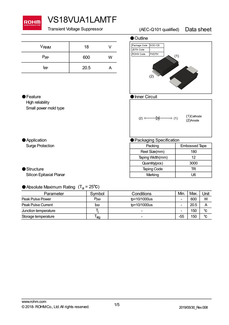 应用领域:VS5V0UA1LAMTF是适合浪涌保护用途的小型模件封装的TVS二极管。是车载级的高可靠性产品。