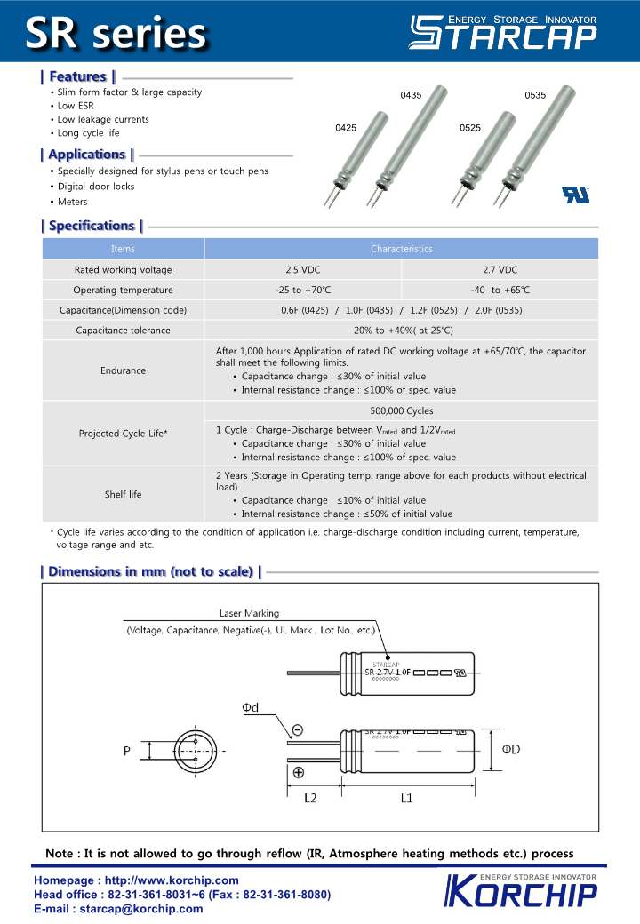 韩国高吉普Korchip扣式超级法拉电容 SR2R7105