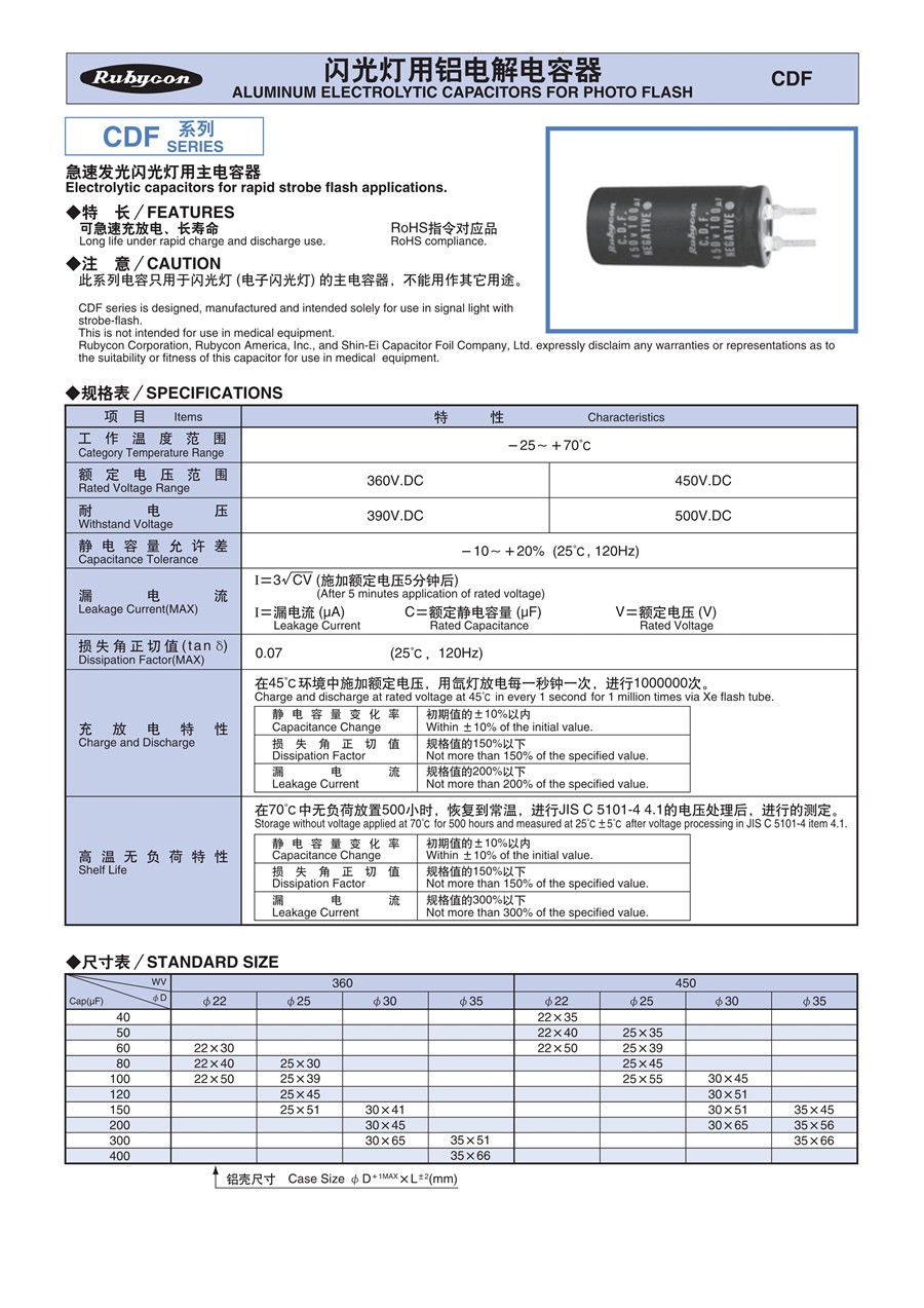 红宝石RUBYCON闪光灯用铝电解电容器CDF系列