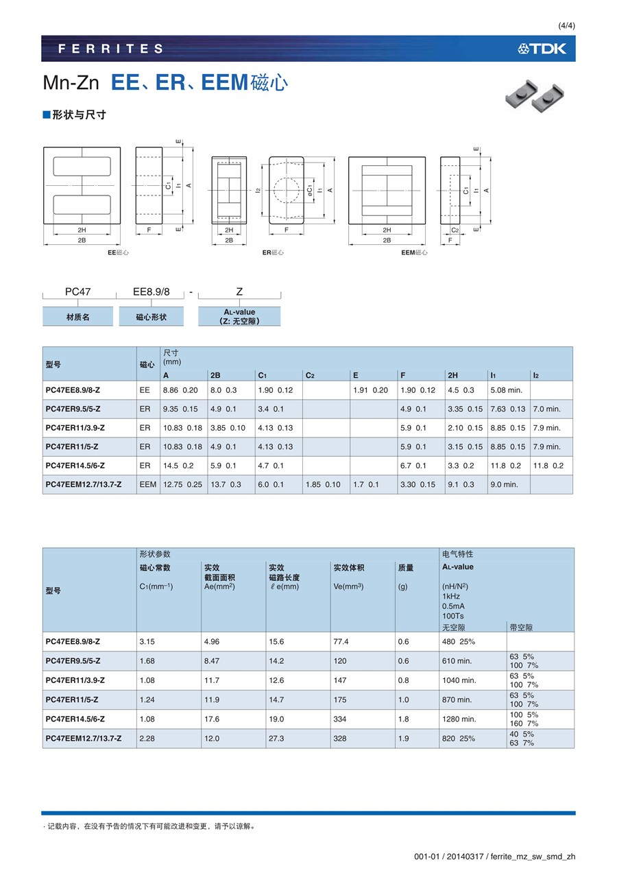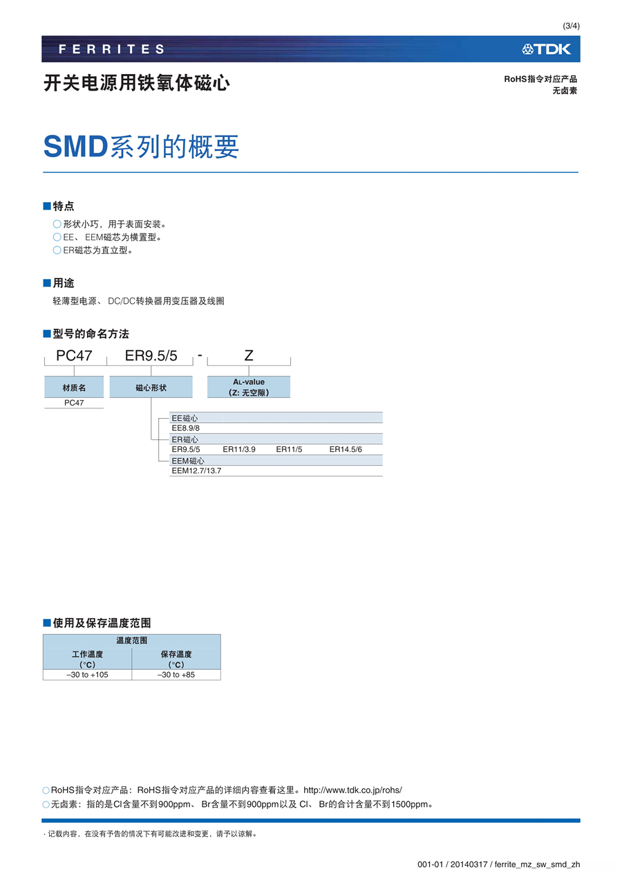 TDK开关电源用铁氧体磁芯SMD系列EE、ER、EEM磁芯