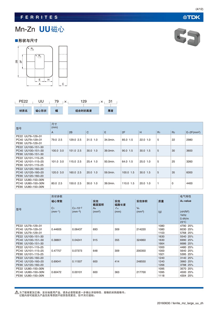 TDK开关电源用铁氧体磁芯UU系列Mn-Zn UU磁芯