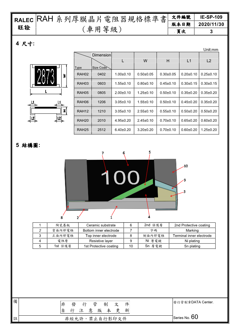 应用领域:车用厚膜高功率芯片电阻,适用于汽车电子与工业产品应用符合AEC-Q200规范适用于无铅产品应用