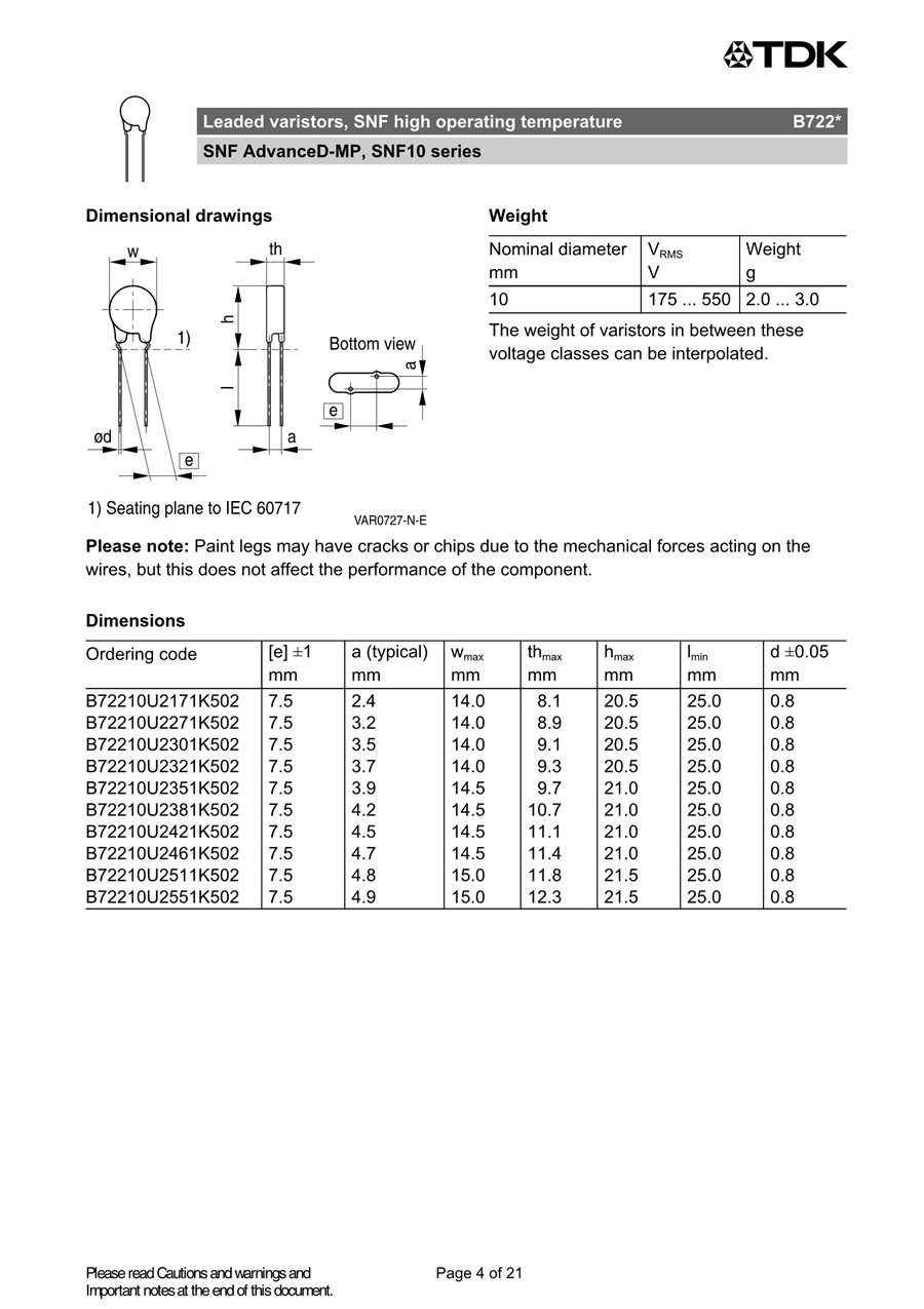 TDK引线式盘压敏变阻器工业用AdvanceD-MP SNF系列B72210U2*K502