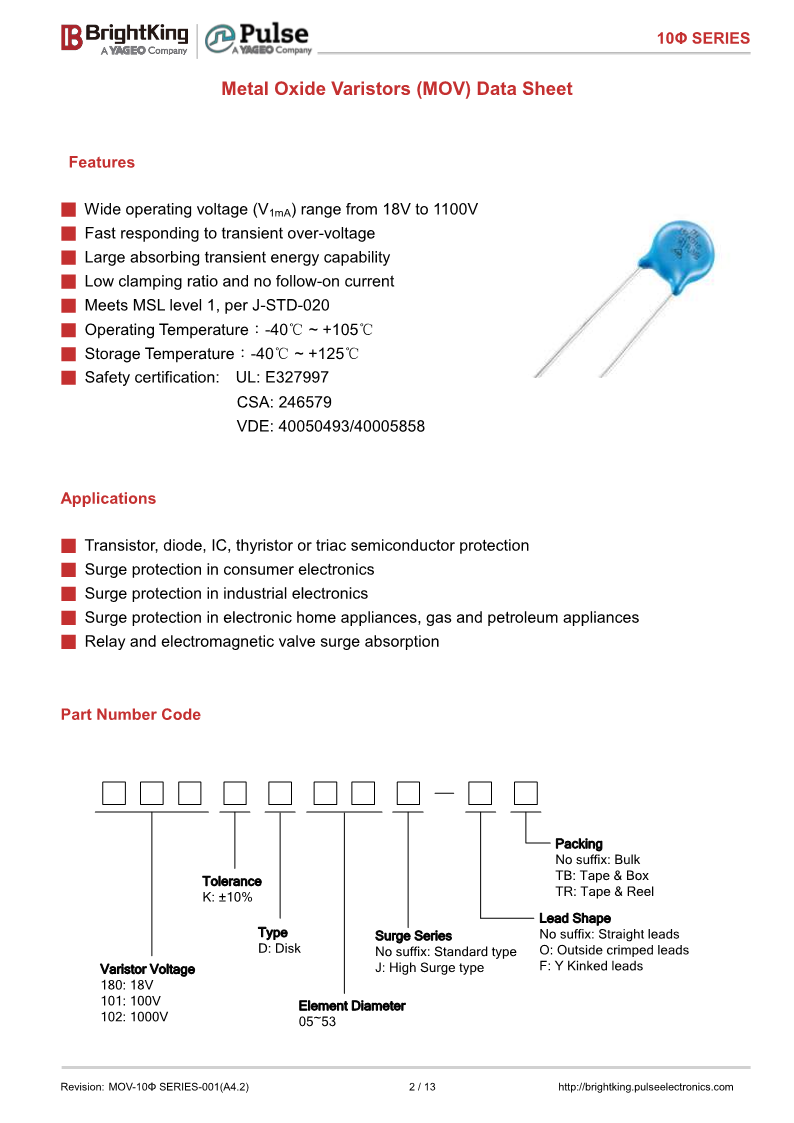 压敏电阻君耀BrightKing压敏电阻插件压敏电阻10系列201KD10 201KD10J