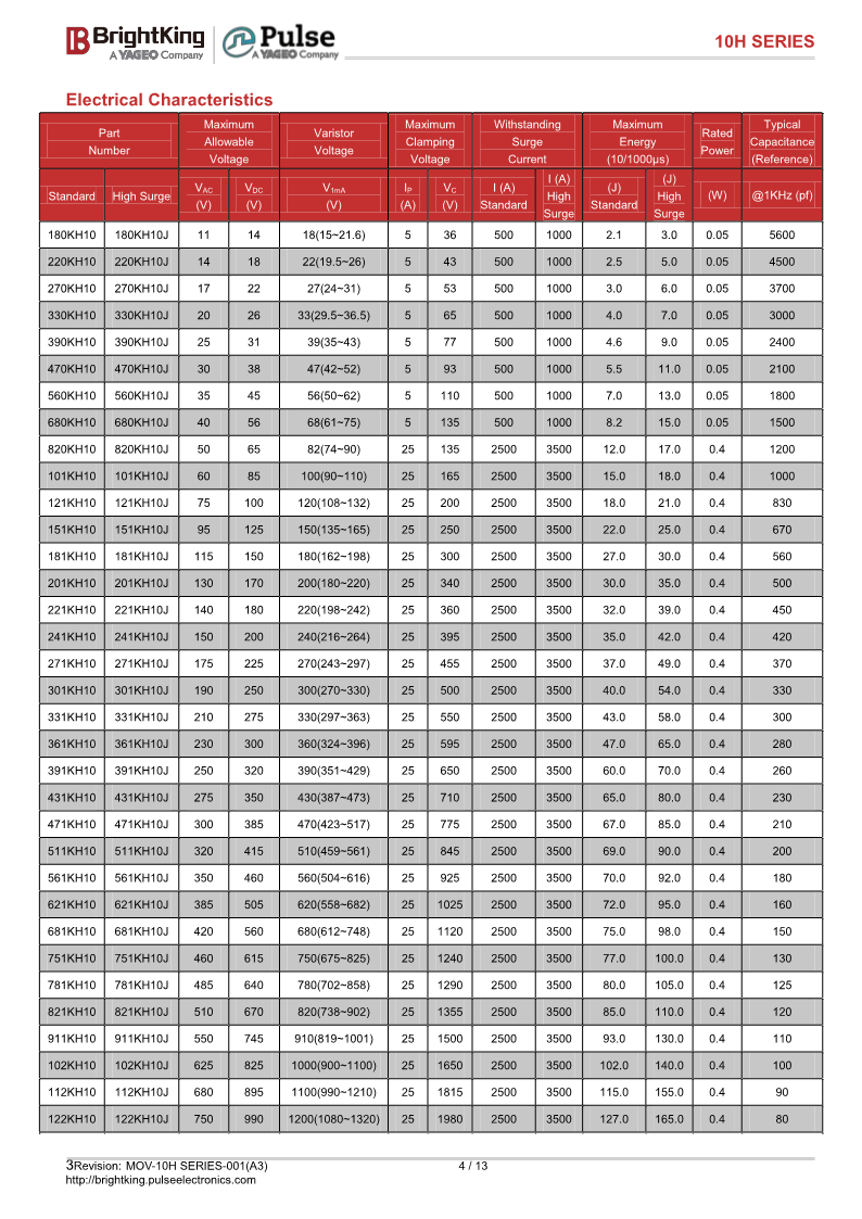 君耀BrightKing压敏电阻 插件压敏电阻10H 系列121KH10 121KH10J