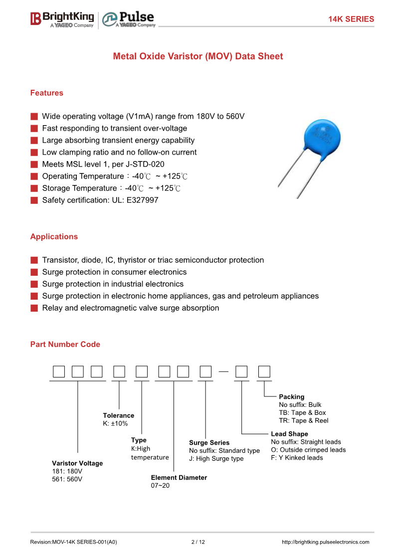 君耀BrightKing压敏电阻高温环氧树脂MOV压敏电阻14K 系列331KK14 331KK14J