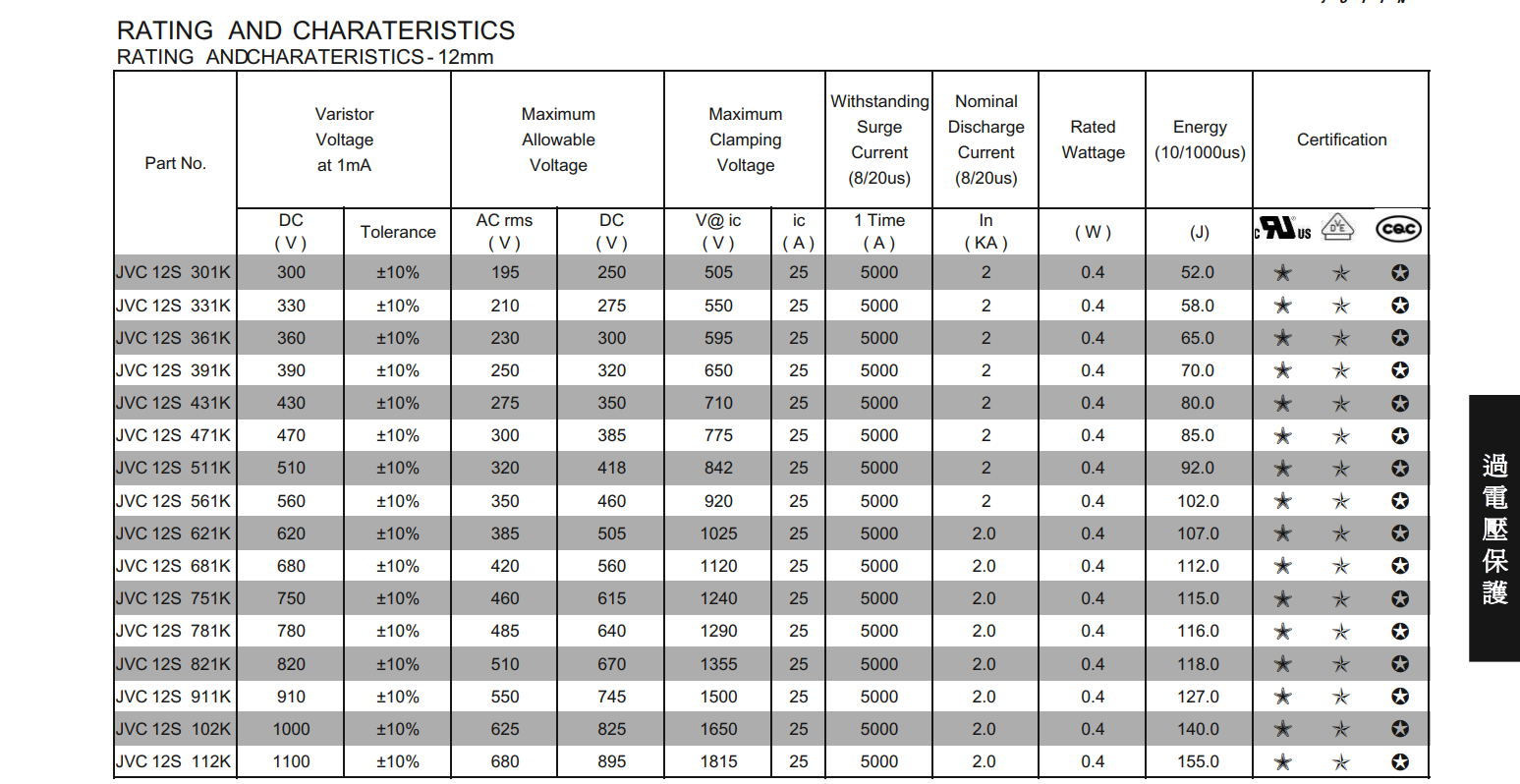 应用领域:高浪涌电流JVC系列是专为高瞬态浪涌抑制而设计的。它们是径向引线压敏电阻(MOV或VDR),在AC线路一次或直流电路中连续使用。