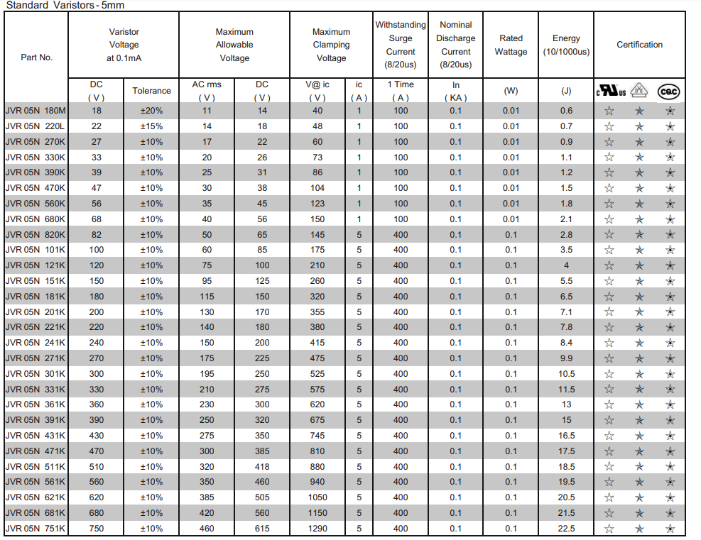 应用领域:金属氧化物压敏电阻(MOV或VDR)是电压依赖性电阻器,具有对称的电压-电流特性,旨在保护各种电子设备或元件免受开关脉冲或感应雷电浪涌的影响。它的非线性特性具有广泛的应用范围,从低到高的电压等级保护(AC11V-1000 V为可用范围),在各种级别的电气和电子设备中逐渐被采用,并具有批量生产的可行性。